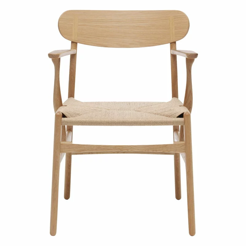La sedia CH26 è realizzata in rovere e ultimata da una seduta intrecciata a mano, comoda a tal punto da potervici sedere per periodi di tempo prolungati. Grazie al design sofisticato e alle proporzioni perfette, CH26 è ideale come sedia da pranzo.