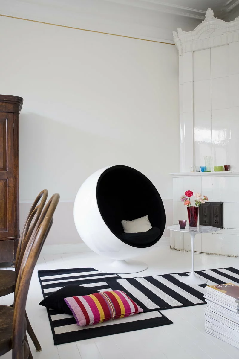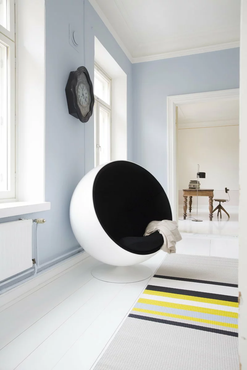 Nel 2021 la Ball Chair è stata aggiornata e rivestita con un tessuto di lana sviluppato appositamente per questa seduta. L’iconica Ball Chair è disponibile di diverse combinazioni di colori, ma si dice che la sedia con guscio bianco e rivestimento nero sia la preferita di Aarnio: secondo il designer, il tessuto sembra come una costanza sconosciuta e misteriosa che si diffonde all’interno della sedia.