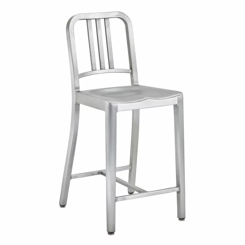 Lo sedia da bar 1006 Navy di Emeco è una scelta estremamente duratura e funzionale per la penisola in cucina, il bancone del bar e anche per gli spazi all’aperto. Lo sgabello è realizzato in alluminio riciclato e il processo di produzione ha 77 diverse fasi in totale. La sedia da bar 1006 Navy ha una garanzia a vita.