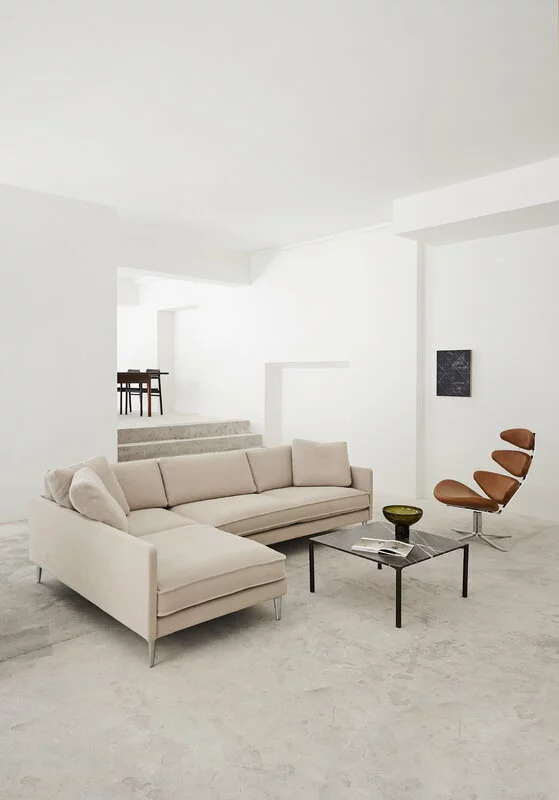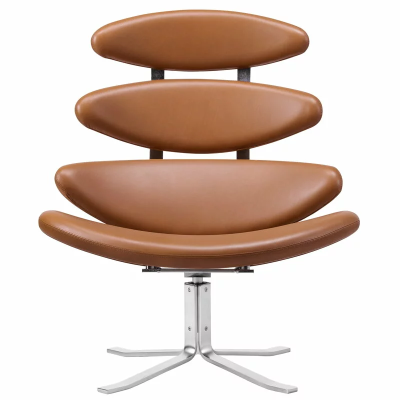 La sedia Corona di Fredericia è un’icona del design, creata da Poul M. Volther nel 1964. Questa mitica poltrona, con la sua memorabile silhouette, è apparsa in moltissimi film e video musicali. La sedia Corona, eccellente dal punto di vista sia estetico che pratico, è composta da quattro cuscinetti ellittici e una robusta base girevole in cromo opaco.