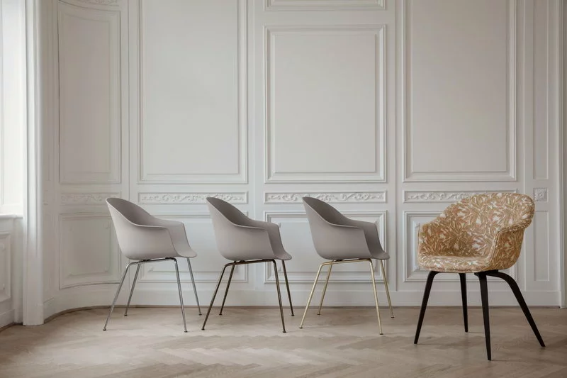 La sedia Bat di GUBI deve il nome e l’ispirazione per la sua graziosa forma alle linee dell’apertura alare del pipistrello. Disegnata dal duo italo-danese GamFratesi, la sedia Bat unisce un invitante guscio e gambe in ottone sottili e diagonali. L’aspetto della sedia Bat è minimalista e allo stesso tempo dinamico – una via di mezzo tra il classico e il sorprendente – e questo rende la sedia adatta attorno al tavolo da pranzo o nella sala riunioni. La sedia è disponibile in diversi colori, materiali e finiture.