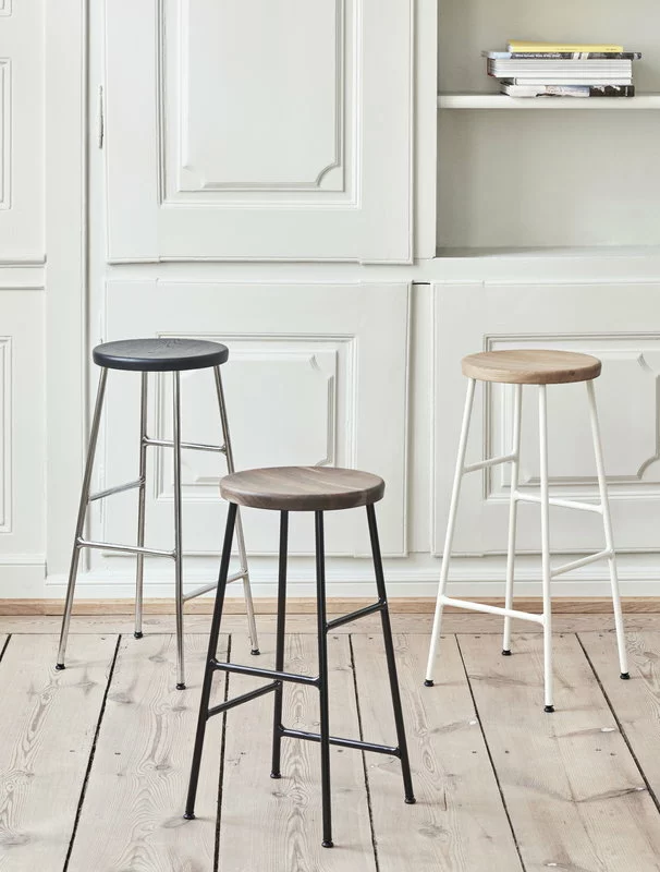 Cornet di HAY è un raffinato sgabello da bar la cui struttura si ispira ai tubolari d’acciaio usati nelle biciclette. Su ogni lato è sistemato ad altezza diversa un tubolare che fa da poggiapiedi. Oltre a donare alla sedia un interessante aspetto simmetrico, questa soluzione rende i poggiapiedi di Cornet perfetti per persone di qualsiasi altezza. L’aspetto geometrico di Cornet è completato da una seduta rotonda in legno. Lo sgabello da bar Cornet è una creazione di Jonas Trampdach – ideale per i piani della cucina, i tavoli da bar e i punti lavoro – che donerà un tocco di design danese sia a casa che in luoghi pubblici.