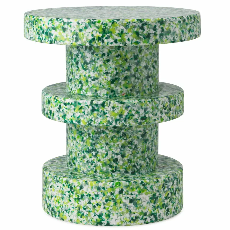 Lo sgabello Bit di Normann Copenaghen è un mobile multiuso deliziosamente originale che funge da sedia, tavolino e supporto per fiori e piante. Disegnato da Simon Legald, lo sgabello è realizzato in plastica riciclata, e la sua forma monolitica è ravvivata da una superficie puntinata che emerge dal materiale: durante il processo di produzione dello sgabello, pezzi di plastica fusa di varie tonalità si depositano su ciascun esemplare in modo leggermente diverso. Quindi, ogni sgabello è anche unico.
