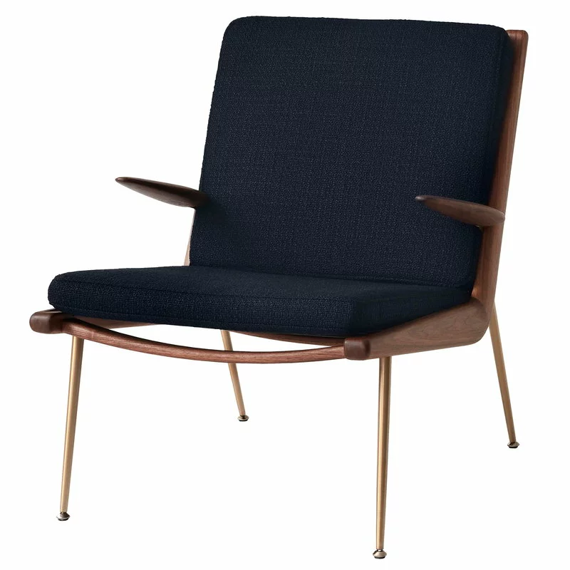 La poltrona Boomerang di &Tradition è un ottimo esempio dell’estetica minimalista del modernismo danese. Disegnata da Hvidt & Mølgaard nel 1956, la poltrona consiste in eleganti e soffici cuscini e in una struttura in legno levigata a mano con sottili gambe in ottone. La barra in legno curvato sul davanti costituisce un dettaglio simpatico all’interno del semplice design. Il nome della poltrona Boomerang deriva dalla sua forma – vista di lato, la struttura a L somiglia ad un boomerang.