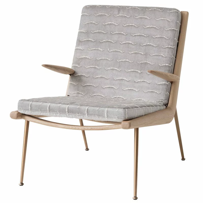 La poltrona Boomerang di &Tradition è un ottimo esempio dell’estetica minimalista del modernismo danese. Disegnata da Hvidt & Mølgaard nel 1956, la poltrona consiste in eleganti e soffici cuscini e in una struttura in legno levigata a mano con sottili gambe in ottone. La barra in legno curvato sul davanti costituisce un dettaglio simpatico all’interno del semplice design. Il nome della poltrona Boomerang deriva dalla sua forma – vista di lato, la struttura a L somiglia ad un boomerang.