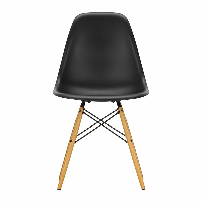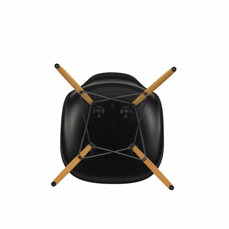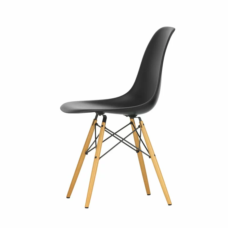La sedia Eames DSW di Vitra ha gambe in legno d’acero sostenute da una struttura in metallo. L’abbreviazione DSW deriva dalle parole Dining Height Side Chair Wood Base.