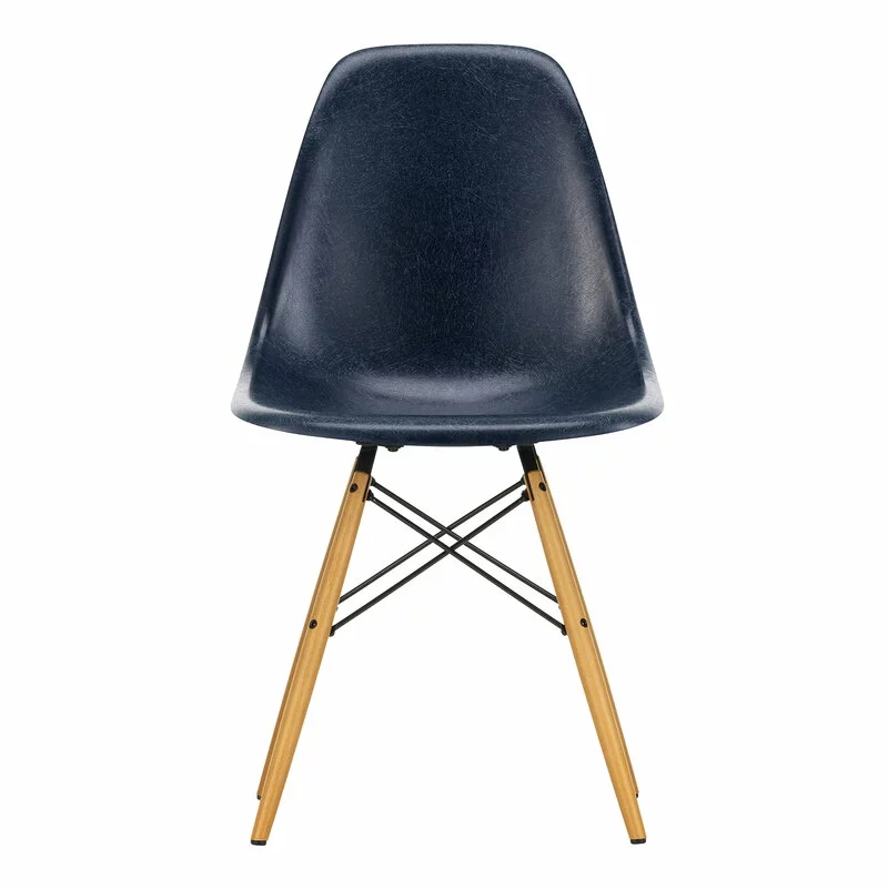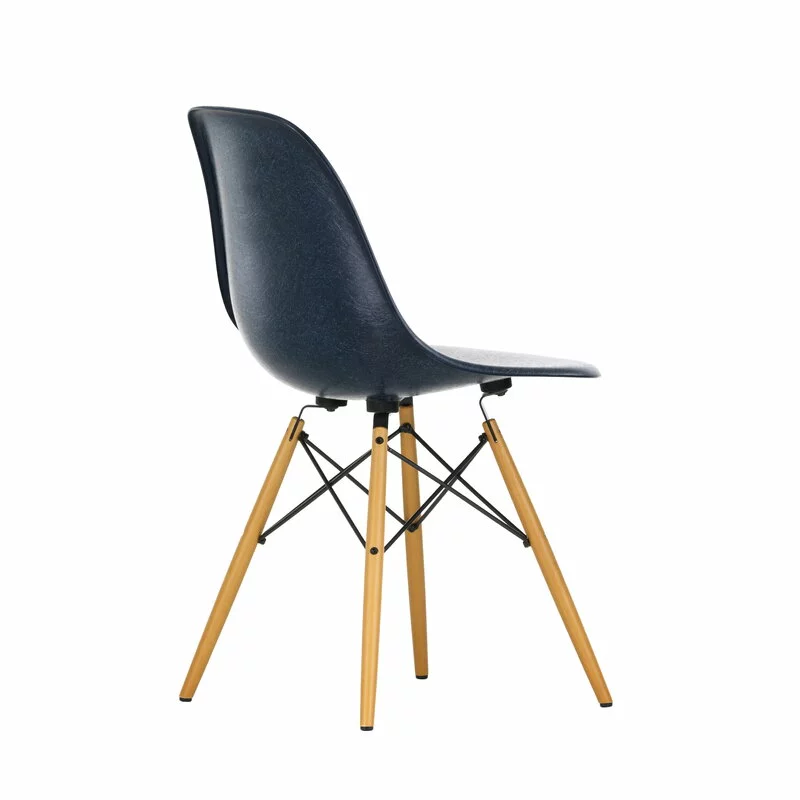 La sedia Eames DSW Fiberglass di Vitra ha una seduta in fibra di vetro e gambe in legno d’acero sostenute da una struttura in metallo. L’abbreviazione DSW deriva dalle parole Dining Height Side Chair Wood Base.