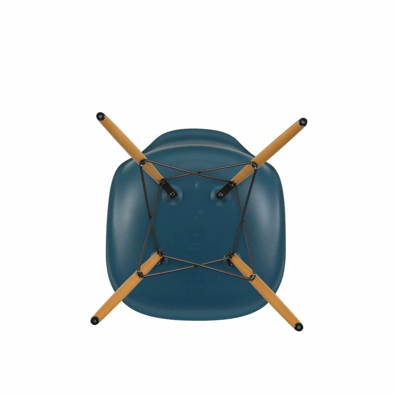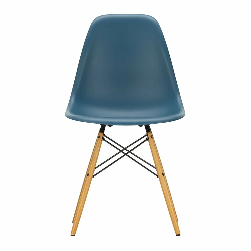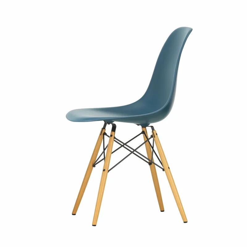 La sedia Eames DSW di Vitra ha gambe in legno d’acero sostenute da una struttura in metallo. L’abbreviazione DSW deriva dalle parole Dining Height Side Chair Wood Base.
