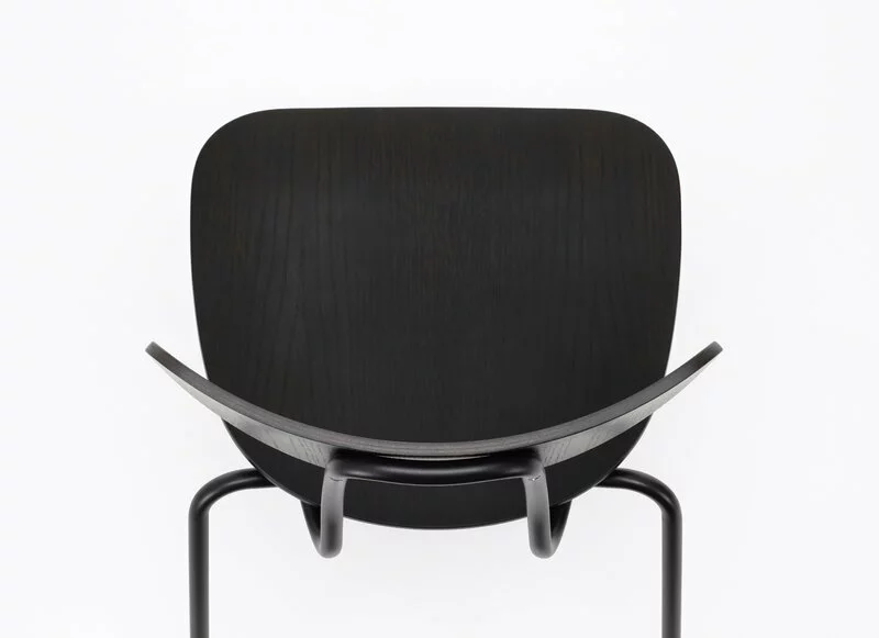 La struttura di Moca consiste in due tubi di metallo, uno dei quali forma le gambe posteriori, mentre l’altro forma le gambe anteriori e il supporto dello schienale. La seduta e lo schienale sono realizzati in multistrato impiallacciato, che rende la sedia leggera e perciò facile da spostare o impilare. Da sotto la sedia fa capolino un dettaglio non appariscente ma pratico, molto tipico di Morrison: il fondo della seduta è ricoperto da una pratica protezione che impedisce che la superficie in impiallacciato si righi quando le sedie vengono impilate.